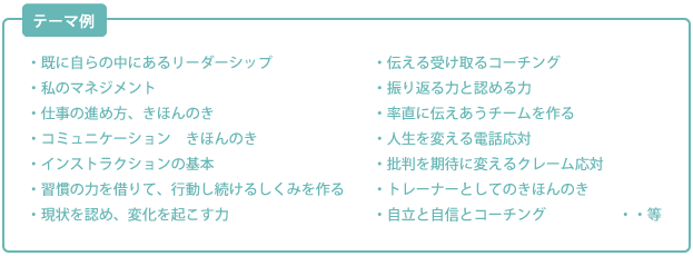 ※コーチングまるけやNHK文化センターで実施しているテーマは、すべて企業研修にアレンジすることが可能です。